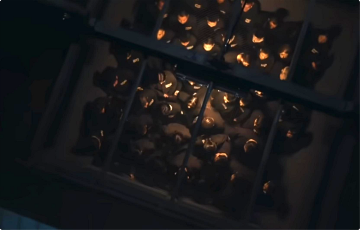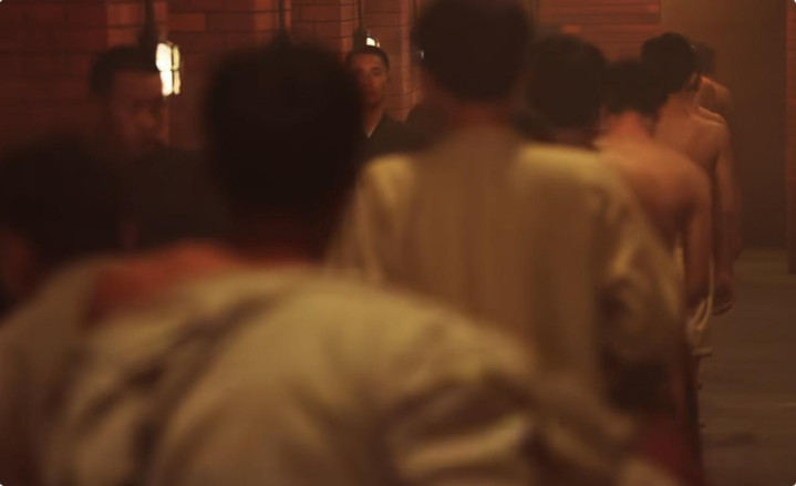 镜头构图也在强调末世一般的氛围,低角度、狭窄空间、格栅阴影、铁栏、牢房,每一处都冰冷又残忍。