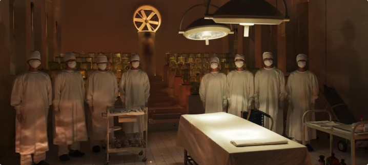 电影整体调色偏铁锈色、灰暗色调为主,画面有很多阴影、光线反差的对比,手术室的冷光白、强光与暗部形成冲突,让人有冰冷的压迫感。