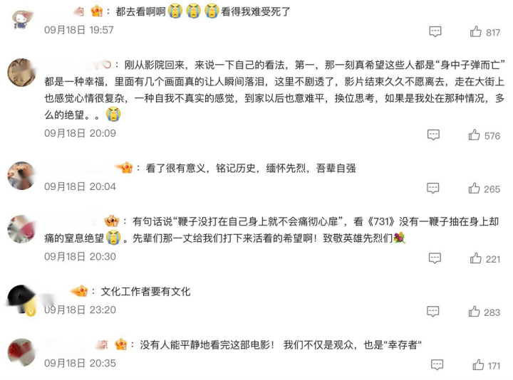 当然口碑方面也展现了电影《731》的潜力,大部分观众对题材的“重量”、对历史的还原、对情感的震撼给出了很高评价,这电影已经远远不只是娱乐意义,更是一次沉重的纪念与反思。