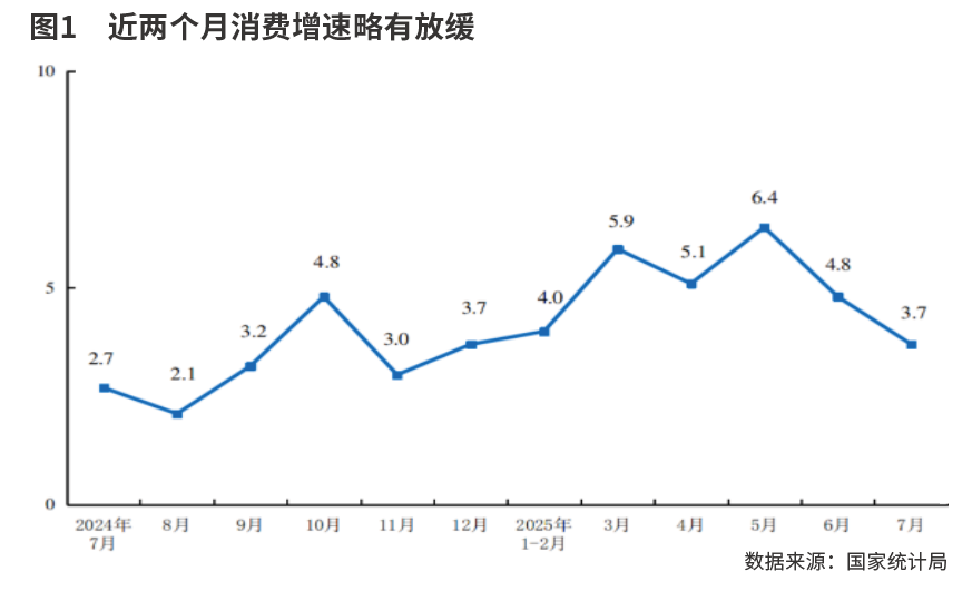 在消费方面,“618”商品消费前置以及天气的影响可能都对7月消费产生了一定的扰动。7月社会消费品零售总额仅增长3.7%,是2025年以来最低增长水平。我们需要注意的是,这并不代表整体消费也明显走弱,因为整体消费包括商品消费和服务性消费。服务市场销售是总体稳定的,1-7月服务零售额同比增长5.2%,与1-6月份基本持平,即7月服务性消费增长并未放缓。